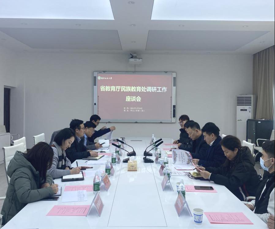 1月19日下午,省教育厅民族教育处处长祁怀好,新疆驻湘工作组党委副书记、教育协调小组组长艾美华,省教育厅民族教育处一级调研员文春华一行3人来校调研少数民族学生教育管理服务工作。会议由学生工作部(处)部(长)向发意主持。
