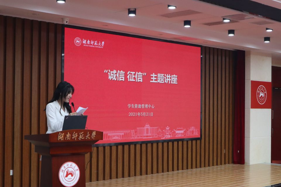 5月21日晚,威廉希尔中文网站平台2021年“诚信、征信”主题宣讲活动在中和楼商学院报告厅举行。活动由学生资助管理中心主办,邀请国家开发银行湖南省分行客户三处廖安龙经理、周健明经理作为宣讲嘉宾,各学院助学贷款学生代表参加活动。活动由新闻传播学院潘颖同学主持。