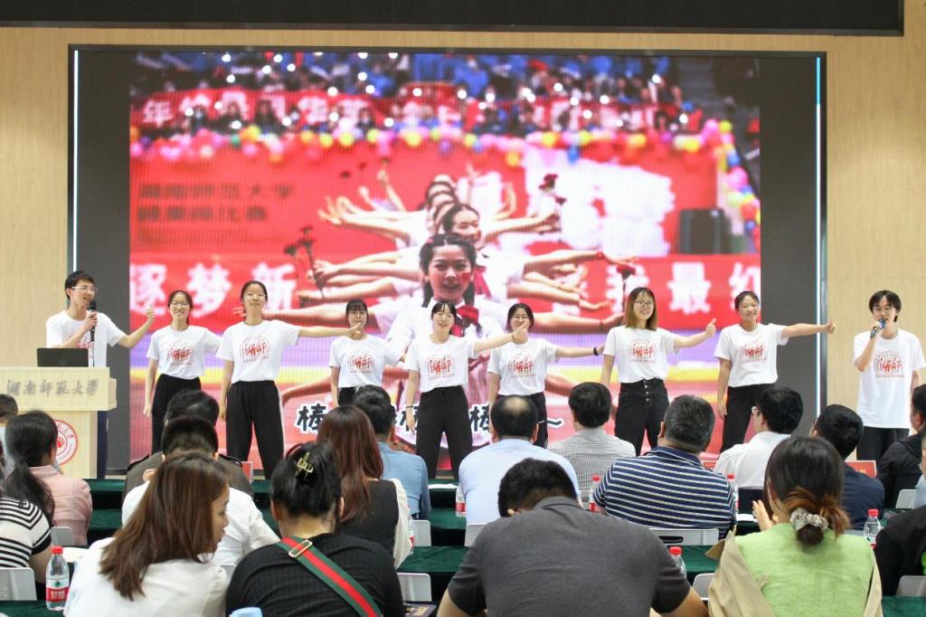外国语学院朋辈心理辅导员代表上演“天天向上”歌舞节目,现场开展有奖知识抢答活动。