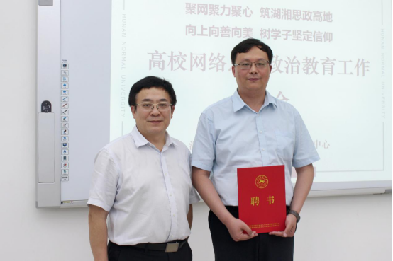 向发意对客人的到来表示热烈欢迎,带领客人参观湖南省高校网络思想政治工作中心。同时,为全国高校辅导员年度人物、全国中青年思想政治工作骨干、全国网络教育名师李萌副教授颁发了“湖南省高校网络思政工作评审专家”聘书。座谈会上,向发意介绍了学校历史沿革及学生工作部特色工作。希望与陕西省、江苏省高校网络思政工作中心加强交流合作、共建共融,构建起多方联动的跨省高校网络思想政治教育体系。