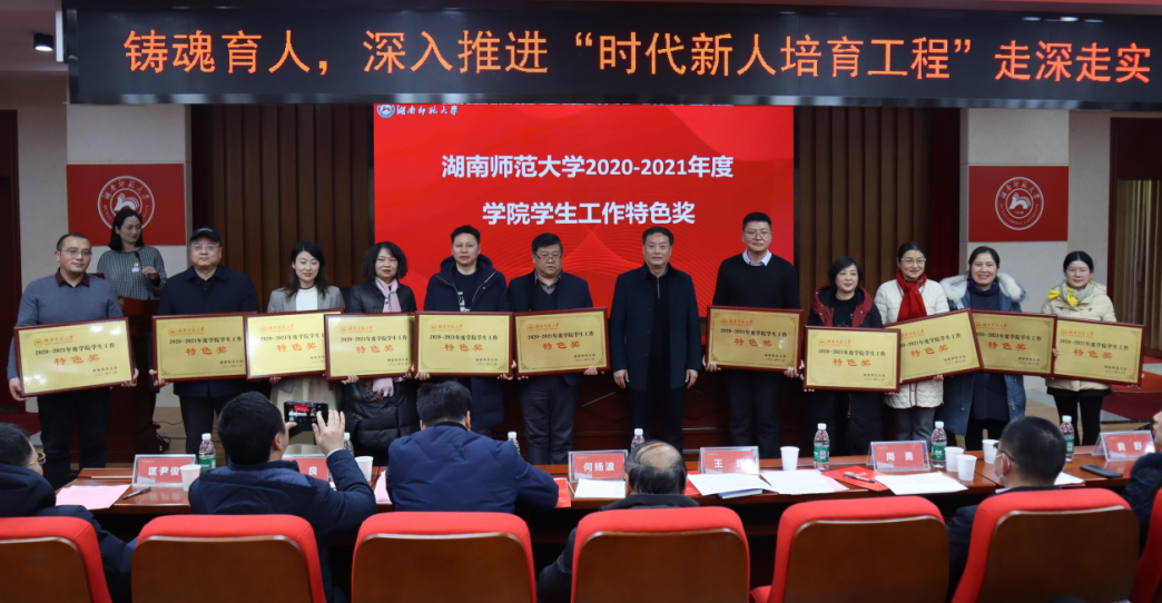 向发意宣布2021年度学院学生工作特色奖、“馨享月十佳辅导员”评选结果,与会领导为获奖单位及个人颁奖。