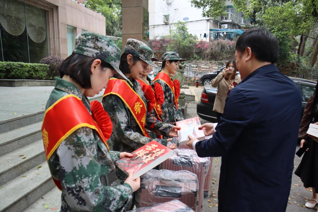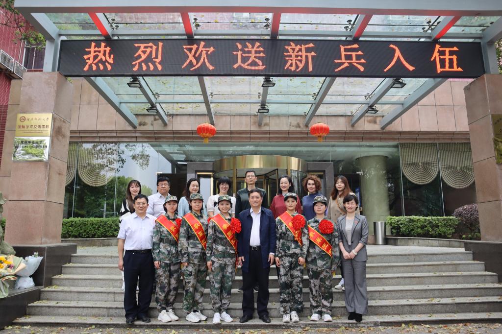 仪式结束,全体人员合影留念。随后,老师们帮助入伍的同学装好行李,叮嘱其注意安全,目送其离开。研究生院党委书记龚舒、党委副书记苏涵琼,学生工作部(处)、武装部副部长彭露,相关学院党委副书记和辅导员参与此次欢送仪式。