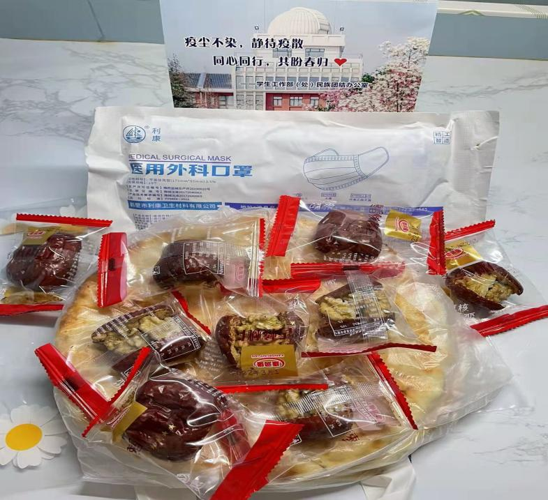 公共管理学院2020 级学生吾热古丽说道:“在封校期间,学校为少数民族学生发放了口罩、馕、枣夹核桃等爱心物资,突然收到来自家乡的美食,我感到无比地幸福和温暖。这让我更加相信国家、政府、学校,只要各民族同胞齐心抗疫,这场战疫我们必定能赢 。”