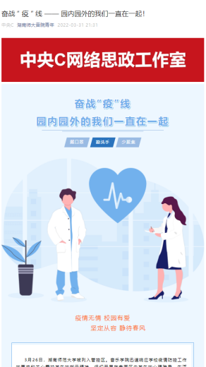 此次抗疫战斗,涌现出了无数抗疫先锋!他们用自己一腔热情、忠诚与担当书写着一个又一个有温度的故事。在接下来的工作中,音乐学院还将再接再厉,号召全体党员干部,继续发挥好基层党组织战斗堡垒作用,把疫情防控工作做实做细。花开“疫”散,我们从“心”出发!