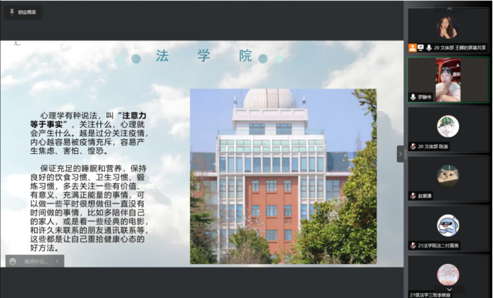 威廉希尔中文网站平台被划入管控区域后,与学生的线下交流被迫暂停,但秉承着“学生在哪儿,我们的工作场所就在哪儿”的精神,辅导员老师迅速反应,收集学生诉求,安抚学生情绪。常规工作上,每日健康打卡不松懈,开启云查课、云查寝新模式。同时,将目光投注到学生心理健康上,一方面召开了“朋心协力,助疫共赢”主题线上会议,向同学们普及心理知识进行心理疏导,引导大家保持积极健康的心态。另一方面邀请党员班导师一同帮助同学们答疑解惑、排遣情绪。毕业年级部分学生正处于不知未来如何选择规划的迷茫阶段,辅导员罗静伟和丁亚琦、刘顺峰、肖姗姗等班导师召开线上班会,针对性解答了同学们包括毕业、论文、考研、考公等在内的困惑。2019级辅导员罗紫薇与班导师罗蓉蓉连线,以寝室为单位与同学们线上交流,了解学生封校期间的心理状况和学习生活情况,引导学生封校期间畅谈烦恼、缓解压力。