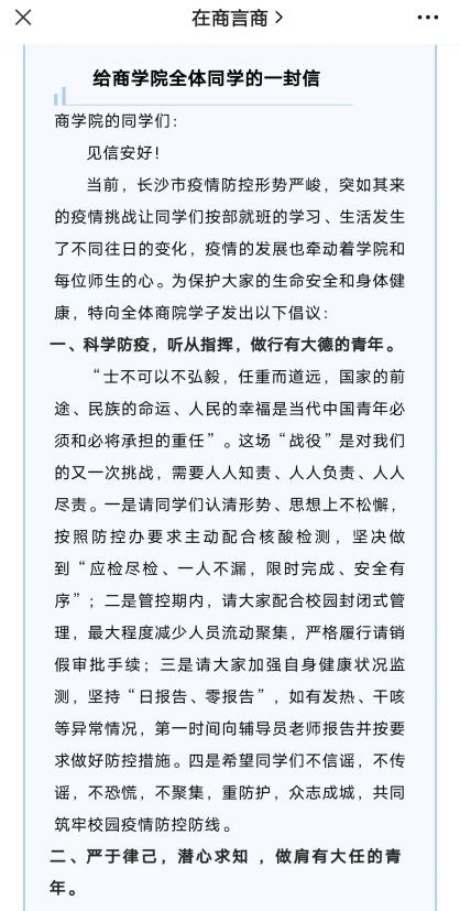 关爱帮助,体现抗疫战疫的温暖。新冠肺炎疫情的突然到来,让学院全体师生的生活发生了改变。为了让同学们更好地适应学习生活上的变化,保持健康良好身心状态,商学院通过微信公众号、视频号,组织教师、校友、辅导员为学生答疑解惑,对同学们的心态调整起到了十分积极的作用。在保证安全及防控到位的前提下,邀请同学们拍摄抗疫相关情景剧、舞蹈歌曲改编视频并发布,有利于同学们调整心情,丰富了疫情之下的生活。对于部分同学线上复试、面试的需要,学院主动向学校反映相关情况,积极解决问题,保证线上复试、面试可以顺利进行。