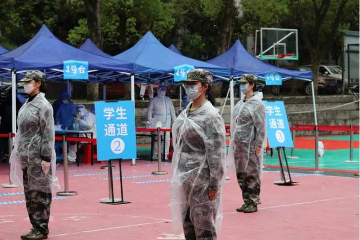 在抗疫一线,志愿者们身穿厚厚的防护服,协助医护人员进行核酸检测,诠释了“奉献、友爱、互助、进步”这一志愿服务精神。同时,学院教官自训队的队员们也积极参与防疫工作。他们不惧风雨挺立在核酸检测现场,维护核酸检测的秩序。