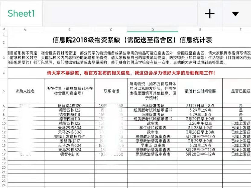 学院认真统计各年级学生的紧缺物资,建立统计表格,通过线上与线下相结合的方式,安全高效地将必要的生活物品与所需资料送达至宿舍区。与此同时,学院充分利用线上交流的优势,建立相关的交流群,密切关注学生的餐食配送问题,协调后勤人员、组织党员志愿者进行点对点配送,切实保障了学生的餐食供应。