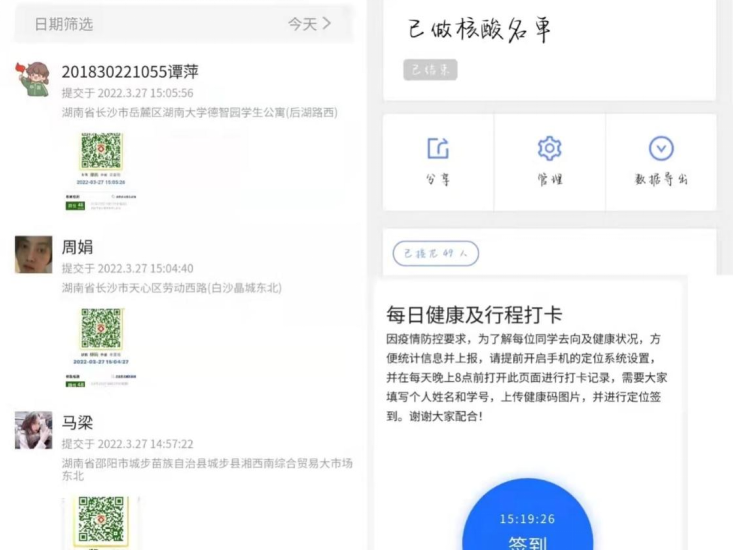 学院切实贯彻学校的相关政策,坚持动态清零,开展多轮核酸检测。自实行封校措施以来,学院分区分段进行核酸检测,在封闭管理期间,每天一检,做到不漏一人,应检尽检。在组织核酸检测的同时,学院实行每日检测报告制度,将统计的任务落实到每个班,密切关注学生每天的健康状况与行程状况。学生们积极配合学院的防控安排,上交健康码截图,进行每日行程打卡,共同助力打赢此次疫情防控阻击战。