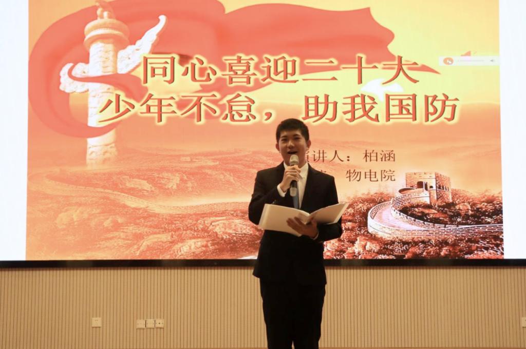 开启时代新征程,爱国强军谱新篇。选手袁妹睿强调国防安全是国之根本,青年人要以梦为马,不负山海,争当时代缔造者。选手黄维分享自身担任教官队一连连长的经历,由学员到教官的身份转变,他感悟到了仁爱精勤、薪火相传的师大精神。选手梁红凯在《入列十年,舰行万里写征程》的演讲中,讲述了中国人民海军辽宁舰十年磨砺一剑的故事。选手庹鹏动情演讲星星之火燎原的故事,引发现场观众共鸣,演讲铿锵有力,呼吁大学生热爱祖国,传承发扬先烈精神。选手文艺以《不忘飞天梦,再筑国防魂》号召大家积极应征入伍,为国防贡献力量。选手吴世辉,作为一名连队新闻报道员,在讲述退伍军人杨国忠的故事时,动情中喊出,“杨总工,您是我的偶像!”,立志弘扬报道更多“爱在国防”的人。董思源出口成章,思想独到,提出大学生应培养居安思危意识,践行青年担当,为国防事业添砖加瓦。其余演讲者也纷纷抒发自己的爱国热情,讲述国防故事,表示要争做有理想、勇担当、敢奋斗的时代青年,以实际行动献礼二十大,加强军事理论学习,宣传国防知识,讲好国防故事,为强国强军贡献力量。演讲比赛现场气氛热烈,加油助威声此起彼伏,掌声经久不息。
