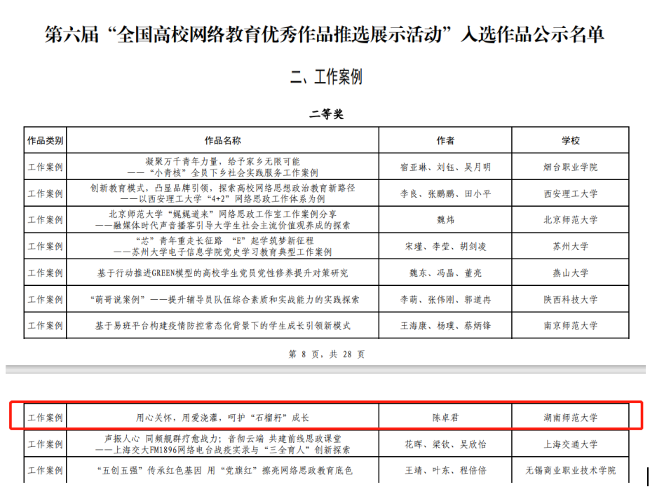 在第六届“全国高校网络教育优秀作品推选展示活动”中,陈卓君老师的作品《用心关怀,用爱浇灌,呵护“石榴籽”生长》荣获工作案例类二等奖。