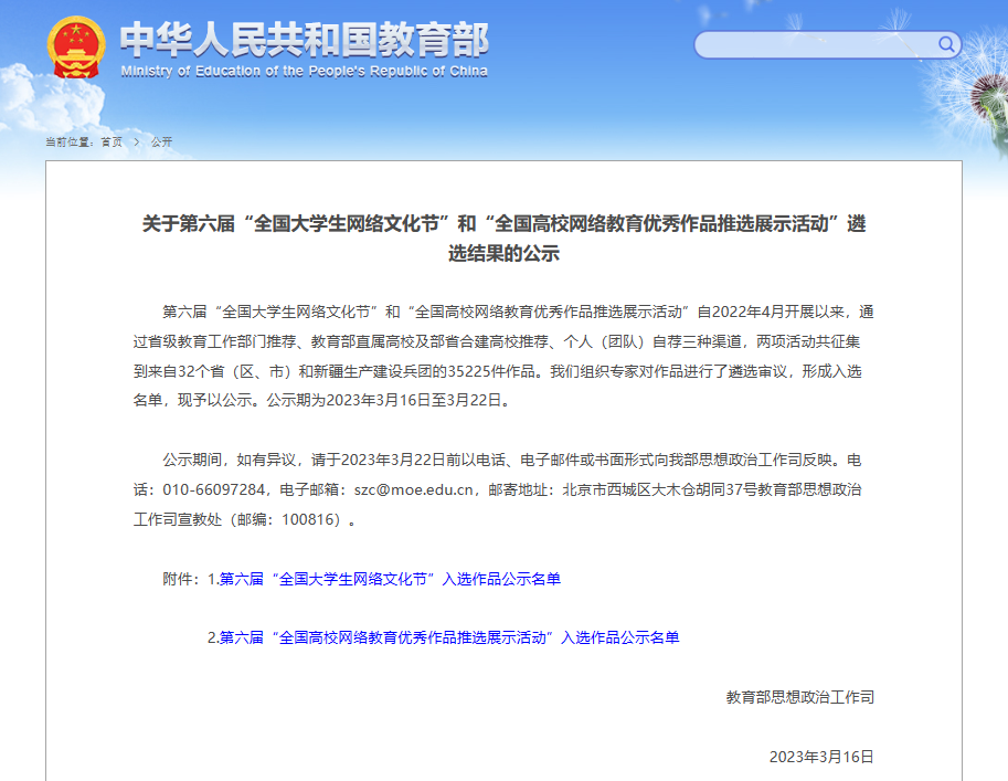据悉,第六届“全国大学生网络文化节”和“全国高校网络教育优秀作品推选展示活动”自2022年4月开展以来,通过省级教育工作部门推荐、教育部直属高校及部省合建高校推荐、个人(团队)自荐三种渠道,两项活动共征集到来自32个省(区、市)和新疆生产建设兵团的35225件作品。活动开展期间,威廉希尔中文网站平台积极组织广大师生参与网络文化作品创作生产,进一步发挥网络文化的育人功能,不断丰富优质网络文化内容供给,活跃校园网络空间生态,全面提升师生网络素养,推进网络文明建设,以实际行动学习宣传贯彻落实党的二十大精神。