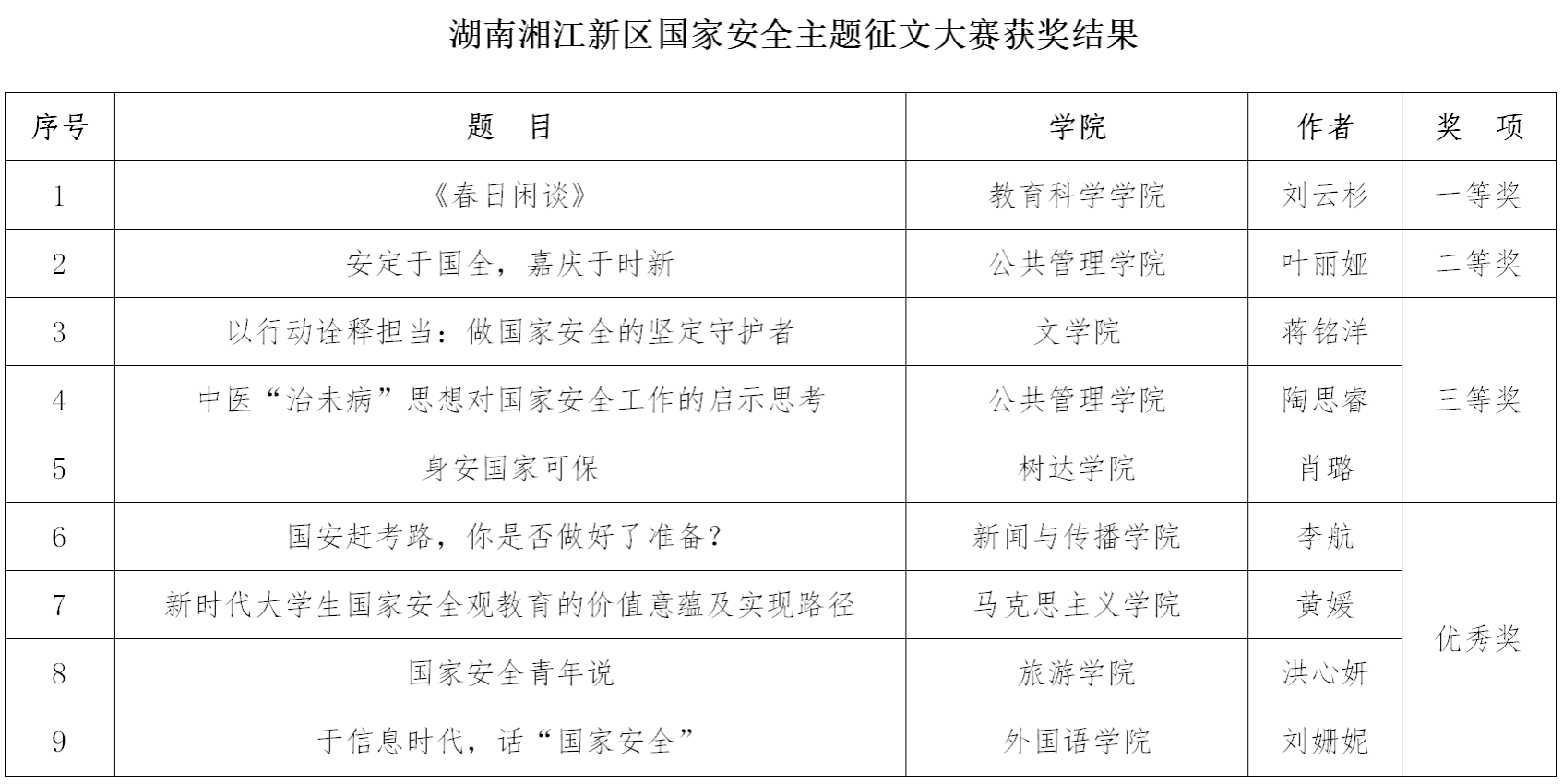 在今年“4·15”全民国家安全教育日到来之前,学校以“你认为的国家安全是什么?”为主题,开展了国家安全主题征文大赛。征文活动共收到学生作品300余篇,经组织评委评审,共评选出校内一等奖2名,二等奖6名,三等奖10名,优秀奖32名,优秀组织奖6个。在此基础上,优中选优推送190余篇作品至湘江新区参赛。