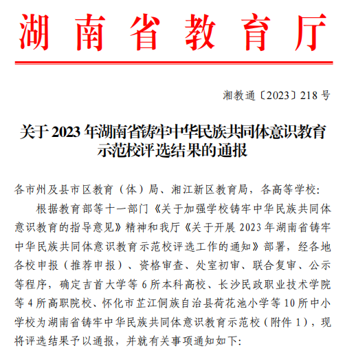 (通讯员 卡的力艳木)近日,湖南省教育厅印发了《关于2023年湖南省铸牢中华民族共同体意识教育示范校评选结果的通报》,威廉希尔中文网站平台荣获湖南省首批“铸牢中华民族共同体意识教育示范校”荣誉称号。