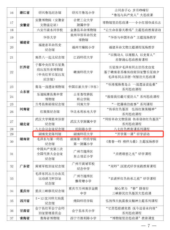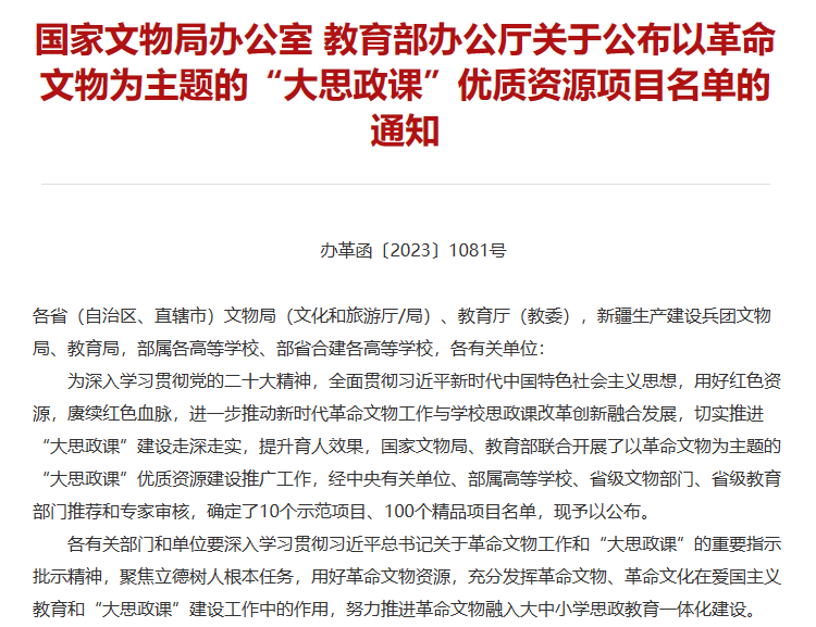 (学生工作部)近日,国家文物局办公室、教育部办公厅联合发布《关于公布以革命文物为主题的“大思政课”优质资源项目名单的通知》,评选出10个示范项目、100个精品项目。威廉希尔中文网站平台与湖南党史陈列馆联合申报的“开学第一课”研学活动项目入选100个精品项目之一。