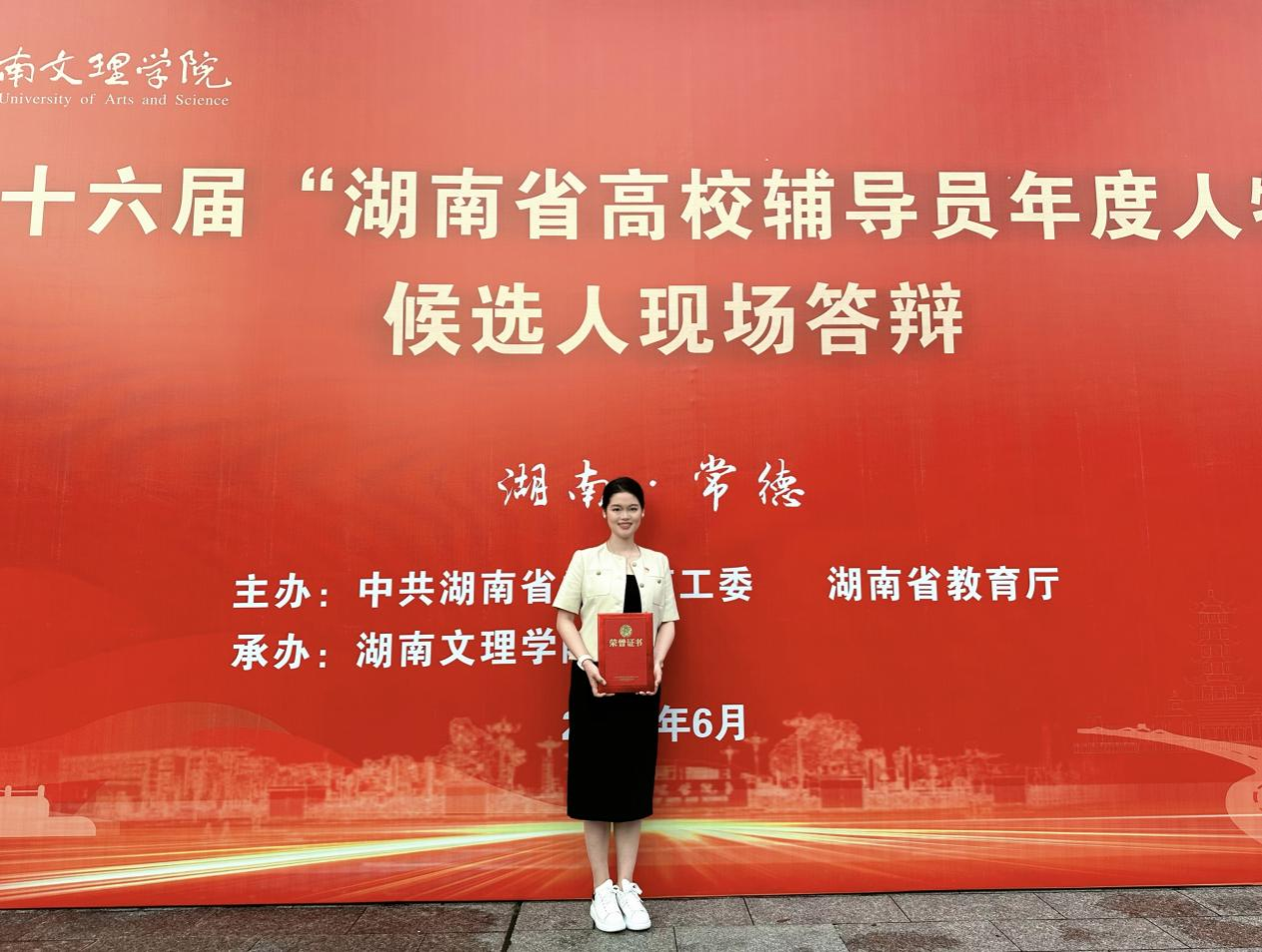 6月20日,由湖南省委教育工委、省教育厅举办的第十六届“湖南省高校辅导员年度人物”候选人现场答辩暨颁奖典礼在湖南文理学院举行,威廉希尔中文网站平台商学院辅导员郭书畅荣获第十六届“湖南省高校辅导员年度人物”。