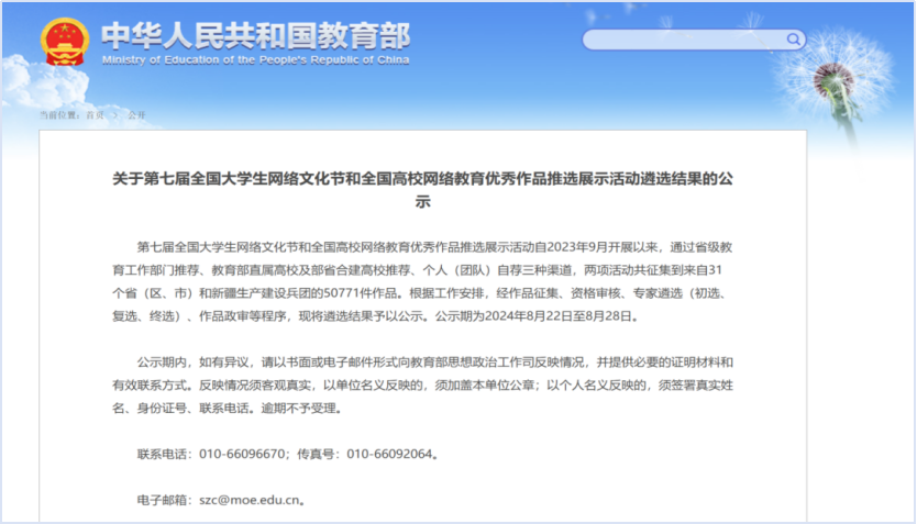 (通讯员 崔蓝心 张馨月)近日,由教育部思想政治工作司和中央网信办网络社会工作局主办的第七届“全国大学生网络文化节”和“全国高校网络教育优秀作品推选展示活动”的遴选结果在教育部官网公示,威廉希尔中文网站平台共5项作品入选。