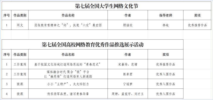 在第七届全国高校网络教育优秀作品推选展示活动中,威廉希尔中文网站平台宋嘉帅、范增的工作案例《基于校园文化场域打造网络思政的“青春范式”》获评为“优秀推荐作品”;陈卓君的工作案例《媒体融合时代 聚合“微”平台 以“融思维”打造网络育人新通路》获评为“优秀入围作品”;宁瑶梦的微课《小小“土特产”,大大科创力》,周婷、孟宸宇、刘才玉的微课《传承将军品质,谱写青春华章》获评为“优秀入围作品”。