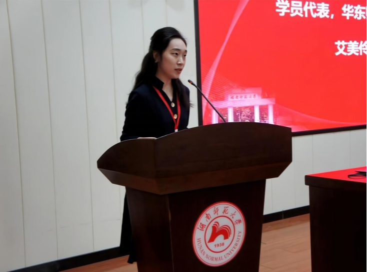 华东师范大学辅导员艾美伶作为学员代表发言。她向精心组织筹备本次培训的主办方表示感谢。她表示,将在本次培训中向各位专家学者认真学习,与各位学工同仁切磋交流,在有限的时间内最大限度的汲取养分,锤炼系统化的科研本领,不断提升前沿性研究力和前瞻性判断力。