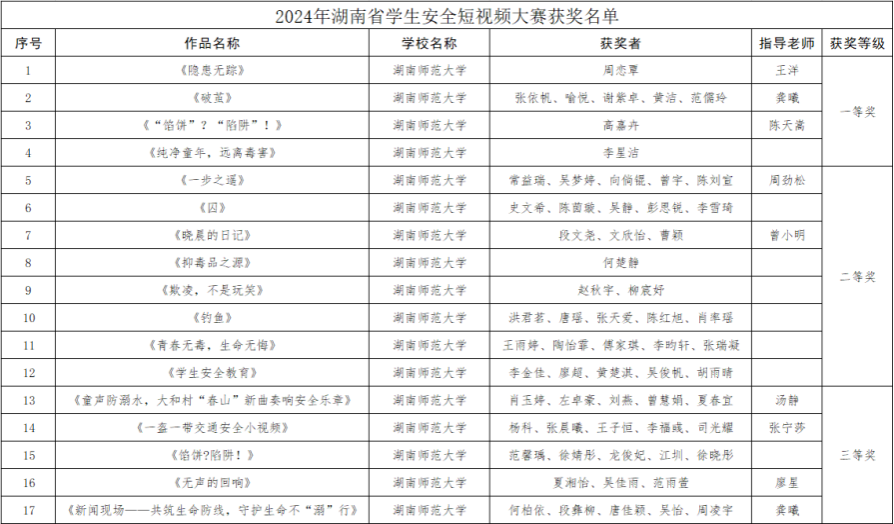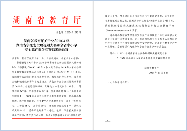 (通讯员 吴波)近日,2024年湖南省学生安全短视频大赛评选结果公布,威廉希尔中文网站平台学子喜获佳绩,共荣获17个奖项。其中,一等奖4项、二等奖8项、三等奖5项,威廉希尔中文网站平台荣获“优秀组织奖”。