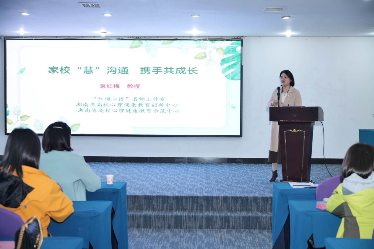 在家校合作沟通技能培训中,特邀嘉宾中南林业科技大学袁红梅教授从家校沟通的常见困境、困境的突破及如何开展有效沟通三个方面进行讲解。她全方位地从学生、家长和学校等多方主体说明了沟通的困境,强调学校应主动构建良好的沟通基础,加强与家长的沟通,增强心理健康教育意识,遵循恰当的谈话原则。并从站稳立场、资源取向、保障安全三个方面阐释了家校沟通的技巧,指出心理育人团队在解决实际问题的同时应当明确风险与后果。