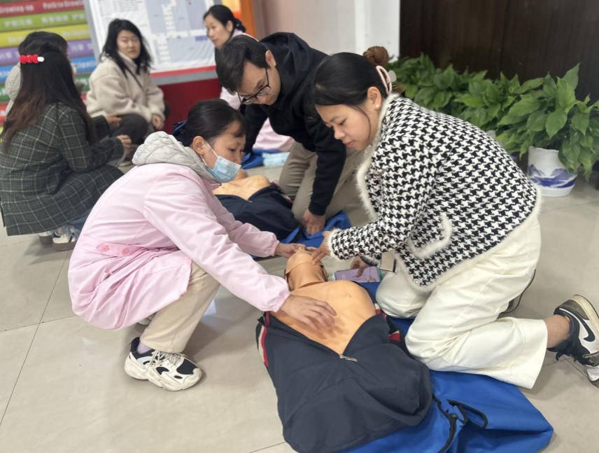 此次培训通过“理论+实践”教学模式,向每一位老师、在场学生普及基础急救知识技能。培训涵盖心肺复苏(CPR)全流程操作及自动体外除颤器(AED)使用方法,通过人体模型进行胸外按压、人工呼吸等标准化训练。创伤救护环节重点教学弹性绷带使用、三角巾包扎、骨折夹板固定等实用技术,校医院医护人员在现场演示不同伤情的差异化处理方案。参训师生在专业指导下反复实操,确保急救动作规范到位。