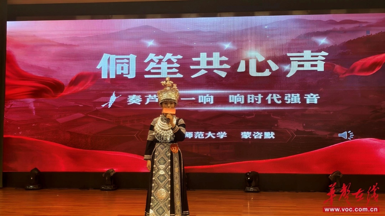 比赛中,蒙咨默以侗家特色乐器“侗笙”为切入点,围绕“中华民族心手相连、共鸣共情”展开演讲,真情抒发了当代青年为民族团结、中国式现代化挺膺担当的青春志向,赢得评委与现场观众认可。