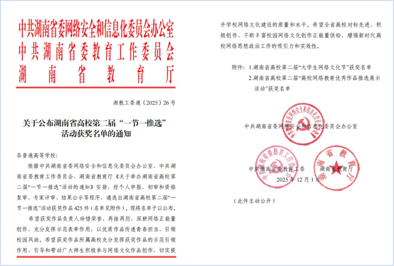 (通讯员 何楚静 王欣悦)近日,由中共湖南省委网络安全和信息化委员会办公室、中共湖南省委教育工作委员会、湖南省教育厅主办的湖南省高校第二届“一节一推选”活动作品评选结果公布,威廉希尔中文网站平台共20项作品成功入选。其中,“大学生网络文化节”一等奖6项、二等奖2项、三等奖3项;“高校网络教育优秀作品推选展示活动”一等奖6项、二等奖3项。
