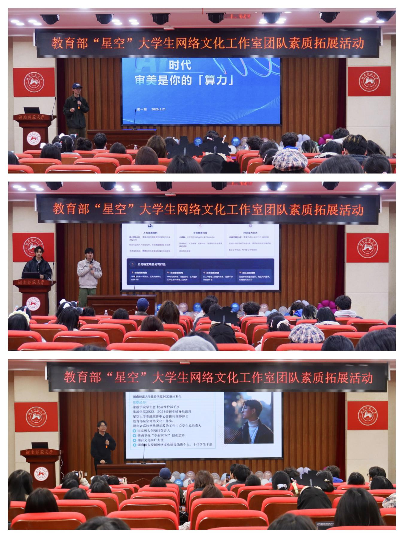 (通讯员 武维拉 陈星宇)为进一步增强团队凝聚力,系统提升成员业务素养与工作能力,3月21日,教育部“星空”大学生网络文化工作室素质拓展活动在中和楼129报告厅举行。学生工作部、武装部副部长段婷,学生工作部网络教育办公室老师熊劲出席。体育学院辅导员梁一然,团队成员杨於道、史英华、肖航受邀作专题分享。体育学院杨蔚洲、音乐学院谢洋清担任主持人。