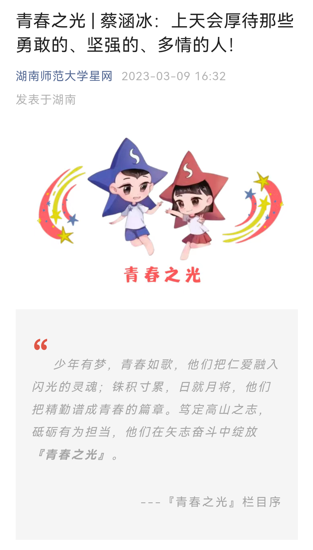 青春之光|蔡涵冰:上天会厚待那些勇敢的、坚强的、多情的人!