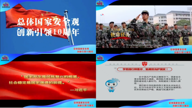 开展一次主题征文,围绕“深刻感受10年来国家安全工作取得的巨大成就”这一主题,让学生主动了解和发掘近年来国家安全形势的深刻变化,通过撰写具有创意和思想深度的文章引导学生积极践行总体国家安全观,共收集征文250余篇;展示一批主题作品,鼓励学生创作“全民国家安全教育”主题作品,累计征集新媒体作品92件,其中平面海报类作品60件、短视频类作品32件,充分体现学生对国家安全的深刻理解和形象表达;举行一次主题班会,各学院通过线上、线下相结合形式,组织各年级学生举行形式多样的主题班会活动,打破传统班会单向宣讲模式,通过创设智能人工AI形象和辅导员领学,帮助学生深入了解国家安全知识和法规知识,以“AI人工智能+国家安全教育”等方式对主题班会活动予以创新,共形成国家安全教育主题班会总结报告94篇。