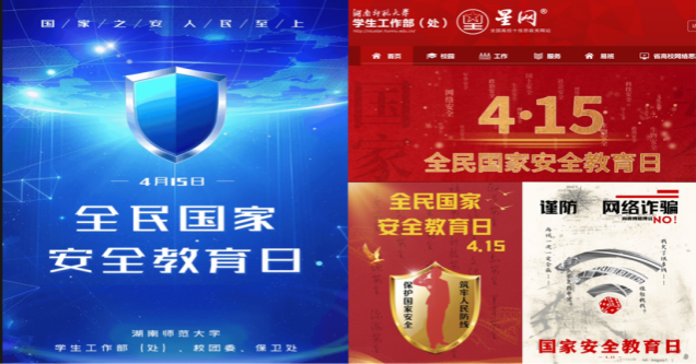 同时,学校依托湖南省高校网络思想政治工作中心,组织发动全省高校积极开展国家安全教育系列活动不断加强师生国家安全意识,中南大学、湖南大学、湘潭大学等诸多省内高校均通过开展大学生安全文化节、设置国家安全主题图文展、举办国家安全宣传月主题宣讲等形式多样的活动,宣讲国家安全知识,设置国家安全教育基地,组织国家安全相关展览,凝聚形成了全体师生维护国家安全的强大合力。