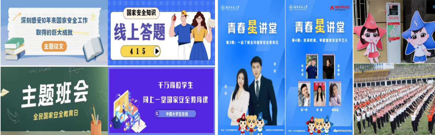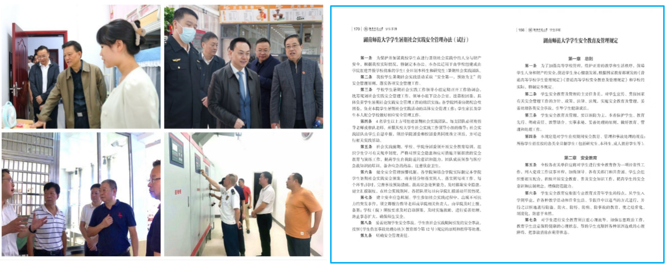 筑牢全员全程“安全墙”。一是校内联动守安全。校院两级联动,将安全教育与教学课程相结合、专家授课与实践参与相结合,将安全教育融入到思政理论课教学;设立心理健康热线,预防、干预学生可能存在的心理问题;每个班级选配医疗健康员、朋辈辅导员,将安全知识、心理健康内化于专业学习、日常生活。二是家校联合保安全。通过假期实地家访、定期线上家访等方式,加强家校沟通,引导家长加强学生的安全、法制意识,关心关注学生的心理健康成长;对于家庭经济困难或遭受自然灾害的家庭提供资助帮扶,凝聚家校合力,打通安全教育“最后一公里”。三是校地联建促安全。联合中国银行、湖南公安、长沙公安等单位,开展消费者权益保护、反电诈进校园等活动,借助《守护解放西》等热门IP,邀请网红民警现身说法、互动交流,以学生喜闻乐见的形式,全方位开展安全教育实践,形成良好的浸润式安全教育氛围。