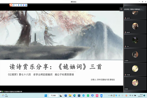 (通讯员 蒋馨仪 齐宇宸)1月1日晚,朝暾文学社开展“品悟红楼经典”系列活动子环节二“读诗赏乐”分享会。此次活动由朝暾文学社邀请对红楼梦有心得的同学进行分享,以线上会议的形式进行,参与人数共计70余人。