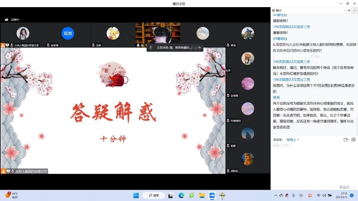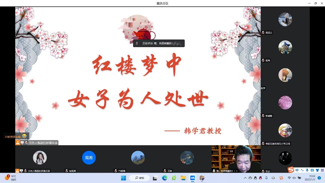 (通讯员 甄颖 王婵 秦安妮)为提升同学们的传统文化素养,增强同学们对《红楼梦》理解,1月11日下午,朝暾文学社开展了以“红楼梦女子为人处世”为主题的讲座。此次讲座以线上会议的形式进行,由威廉希尔中文网站平台威廉希尔中文网站平台古代文学专业副教授韩学君担任主讲人,参与人数共计115人。