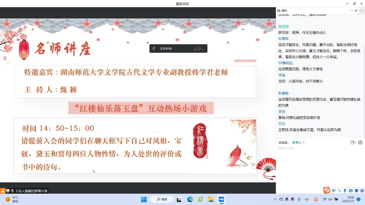 讲座正式开始前,主持人甄颖组织大家进行“红楼仙乐落玉盘”互动热场小游戏。同学们在聊天框里写下自己对凤姐、宝钗、黛玉和贾母四位人物性情、为人处世的评价或书中的诗句,以便在听完讲座后,对比前后对人物的认识的变化。