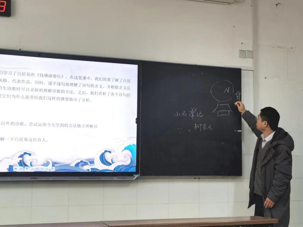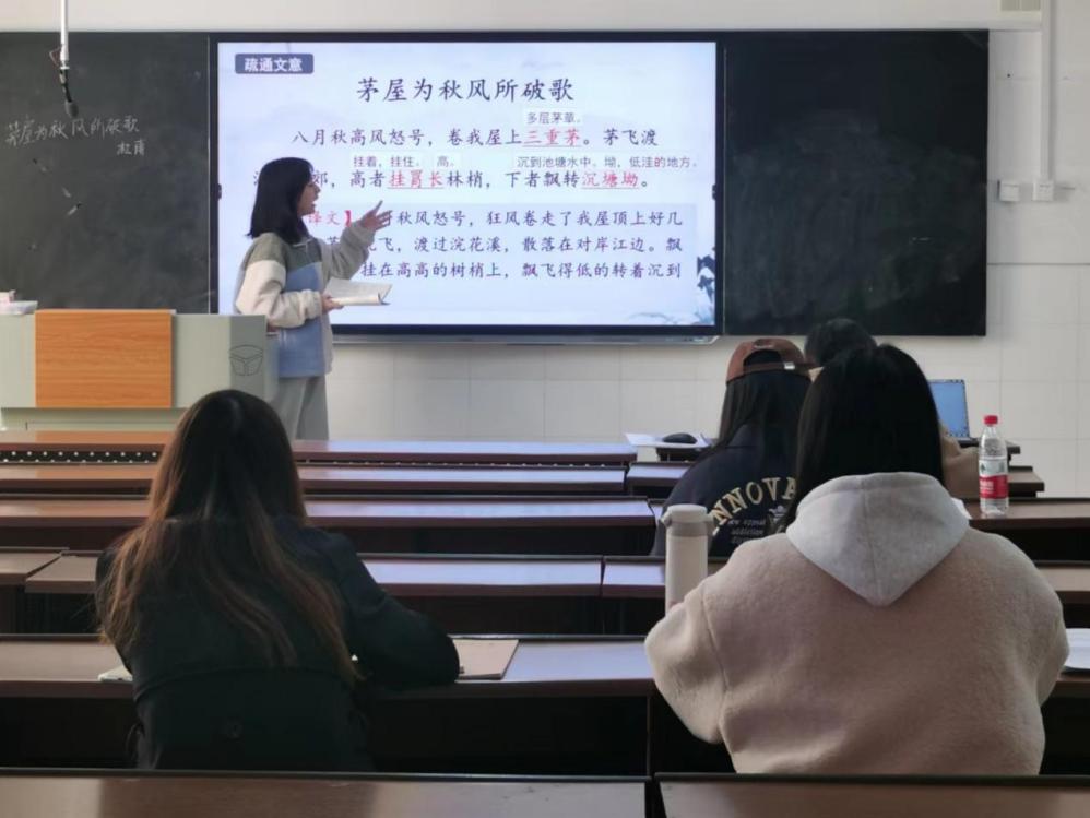 小组试教分为试讲、点评、总结三个部分。16名队员依次上台授课,队员们纷纷提出教学建议,并就教学疑难点进行讨论交流。队员们表示,此次点评交流活动让他们看到了自身的不足,明确了自身改进的方向。试讲结束,邓睿总结了队员的试讲表现,并提出了改进要求:一是教学创新方面,要设置创新点,实现旧文新讲;二是教姿教态方面,要自信大方,多与学生互动。本队实习指导老师郭鹏飞对此次试教进行总结点评并提出建议。他指出,队员们要认真备课,尤其在讲授古文时,需要注重知识的准确性和教学的延展性,让学生学到课本之外的知识。