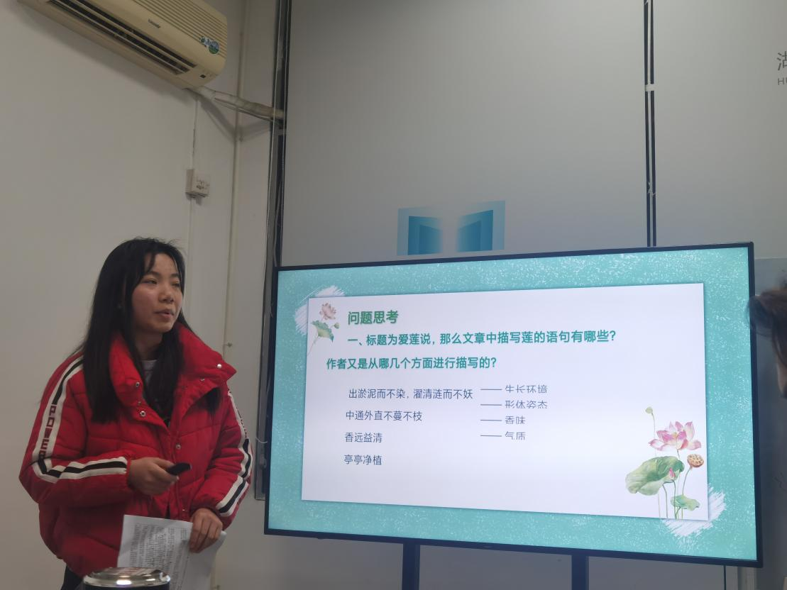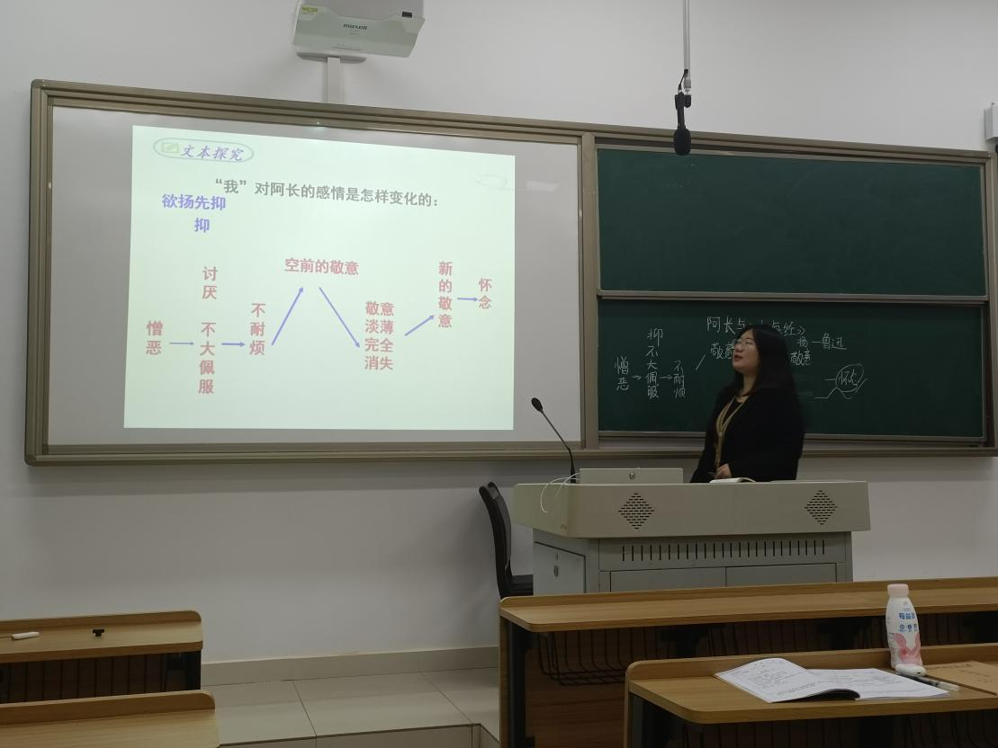 此次试讲内容包含现代文、古诗、文言文三个方面。全体队员总结第一次试讲的经验,针对课堂互动性不强、语速过快和重点不突出的问题做出改正。队员依次试教,每位同学上台试讲十分钟。其余同学认真做好听评课记录。队员们在第一次试讲的基础上,对讲课形式进行创新。采用多种方式,提高课堂的趣味性。其中,吴俊希以《航拍中国》中的片段引入新课;周雪丽讲解《河中石兽》时用表格来进行文章分析;白琳萱以“欲扬先抑”为切入点,分析“长妈妈”的人物形象,讲解透彻。