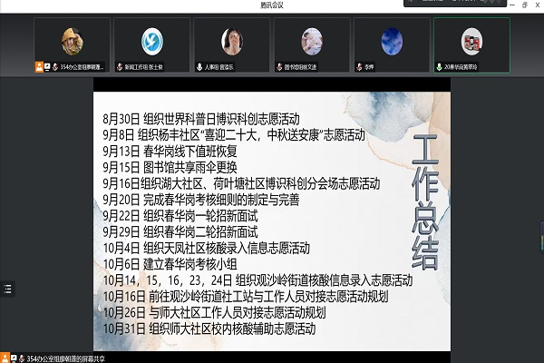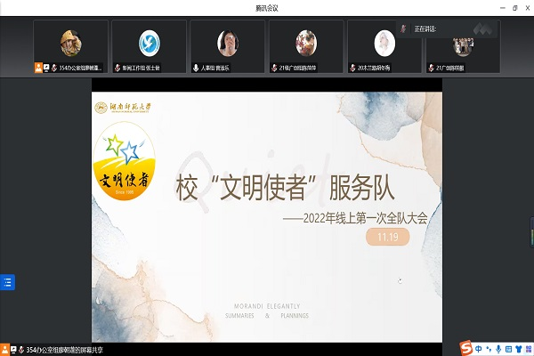 (通讯员 陈羽娜 张士俊)为使新队员深入了解“文明使者”服务队,激发队员工作热情,增强全队凝聚力,11月19日晚,威廉希尔中文网站平台“文明使者”服务队于线上召开本学期第一次全队大会。廖朝蓬、曾添乐主持此次会议。指导老师赵玥和“文明使者”服务队全体队员参加会议。
