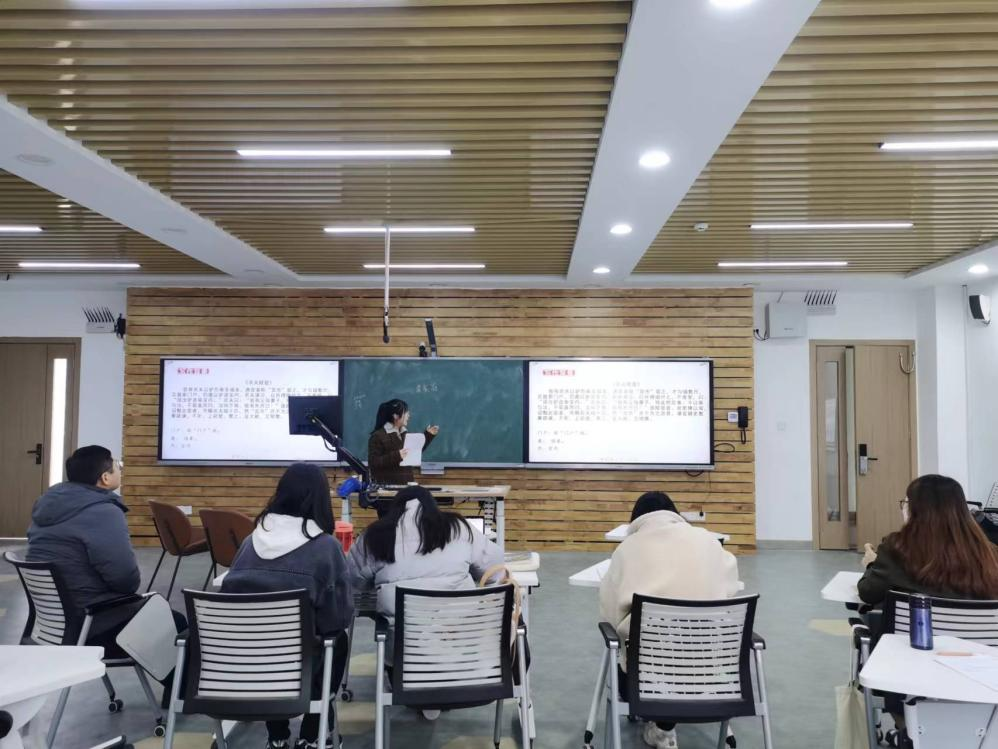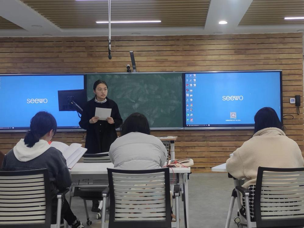 16名队员依次上台授课,队员之间轮流点评。点评过程中,大家就教学目标、教学设计、教授方法等教学问题进行讨论探究,交流互鉴。试教总结环节,邓睿依次点评了队员们的试讲表现。她表示,每位队员在教姿教态、教学设计等方面都取得了明显的提升进步,但仍存在需要改进的地方。各队员需要强化目标意识,教学设计要聚焦学科核心素养,注重设计教学创新点。除此之外,邓睿鼓励大家继续锻炼师范技能并布置了进校前的工作任务。