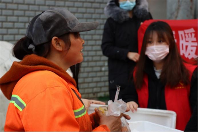 志愿者们分为两个小组,以学生公寓门口为中心,通过设点分发和四处走访向周围工作的环卫工人赠送包子、鸡蛋、粥等食物。环卫工人纷纷向志愿者们表示感谢。