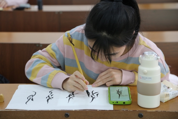 此次主题活动主要分为“走进女书”与“彩绘石膏娃娃”两个部分。在“走进女书”活动现场,各位参与者备好笔墨纸砚,聚精会神地书写出工整美观的女书作品,并反复与字帖比对以臻完美。“彩绘石膏娃娃”活动现场,策划人员向同学们展示不同形状的石膏娃娃底模,供同学们选择。在确定好各自团队的石膏娃娃底模后,同学们纷纷发挥想象力,团队间协调互助,对石膏娃娃进行自由创作。