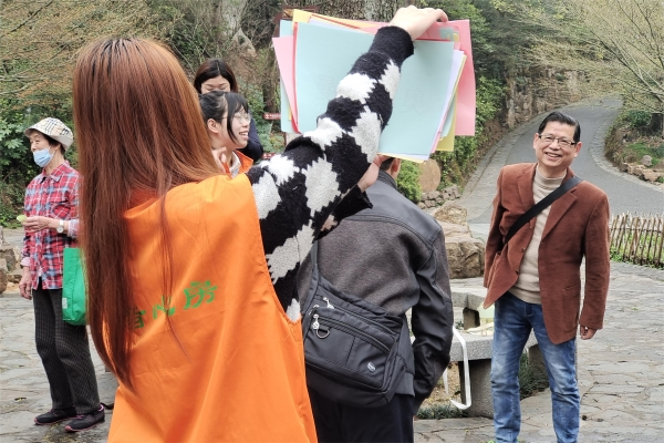 齐欣带领志愿者们在东方红广场集合,并与社区负责人交接好相关事宜后,为每组游戏对应的负责人讲解了游戏玩法规则和相关注意事项。活动伊始,老人们在志愿者的引领下沿着岳麓山向上行进,途经三个游戏点:对暗语、对红歌、你画我猜。老人们依次参加游戏进行通关,并收集印章兑换奖励。活动结束后,志愿者与老人们在终点处拍照留影,并带领老人前往预定地点就餐。