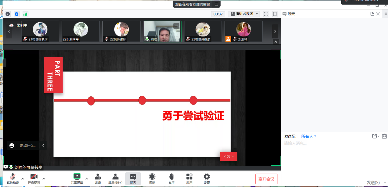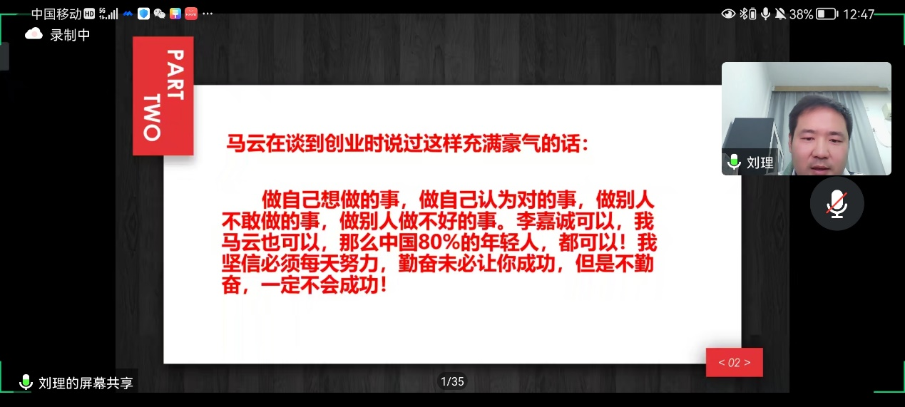 刘理从“创新创业形势”、“创业路艰辛多”、“我们应该如何做”三个方面宣讲此次宣讲会的主题。当提到“创新创业形势”时,刘理表示当前国家战略是营造鼓励创新创业创造的社会氛围,他鼓励有想法的大学生应该积极去参加创新创业活动。在“创业路艰辛多”部分,他提到虽然当今大学生创业难度大,但是创业的过程是有意义的,并用马云关于创业的话鼓励大家勇于去实践自己的想法。刘理也谈到了在创新创业中,大学生应该如何做的方面,他提出大学生要参与科研项目、组建创业团队、勇于尝试验证。