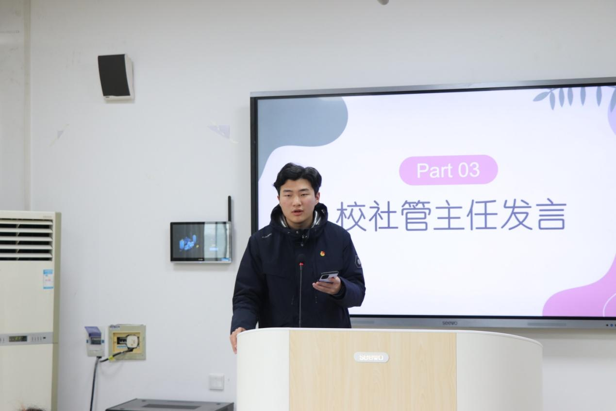 赵颂作总结发言,他肯定了数统院、树达学院学社管的工作成绩,交代社团文化节的相关事宜,并希望各学院学社管加强与校学社管的交流合作,争取共同进步。