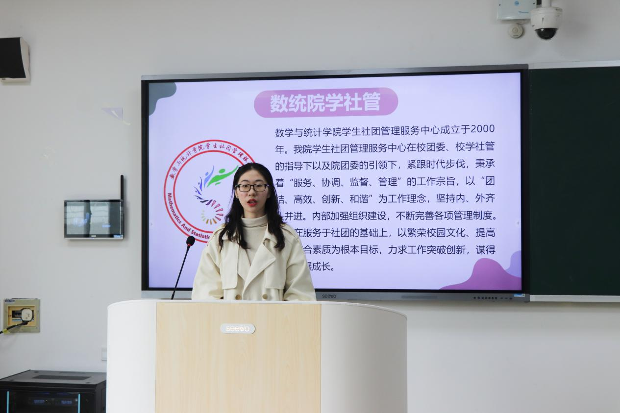 会议在各学院学社管的风采展示中拉开序幕,数统院学社管主任李彦琪、树达学院学社管主任林晓宇轮流上台介绍本系统的相关工作情况以及所获荣誉。绿色志愿者协会、数学应用协会、风华文化艺术社团、阳光公益社团等社团负责人轮流上台展示社团风采,交流社团管理经验以及分享社团成果。