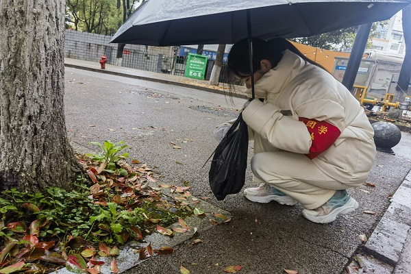 活动开始前,志愿者们根据提前安排的小组集合并领取劳动工具。随后,志愿者们前往指定的劳动区域进行清扫。活动过程中下起雨,各位志愿者打着伞清扫区域内的垃圾、落叶以及砖瓦瓷片,恢复着区域内的环境卫生。历时一个半小时,每一位志愿者完成了各自的清扫任务,由青工部成员检查通过后签退离开。