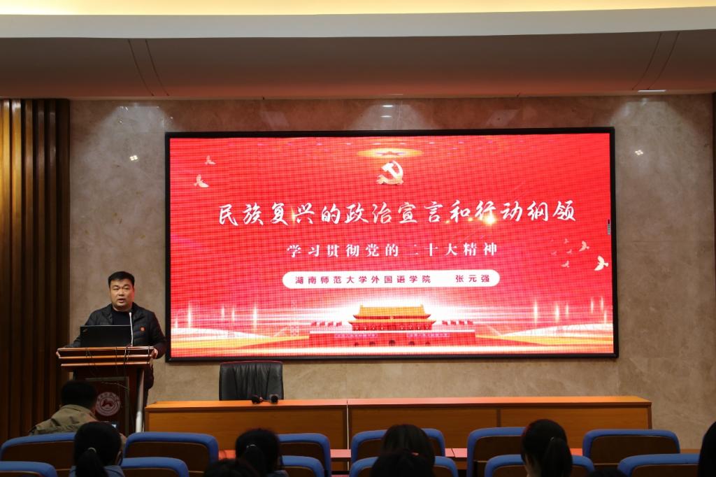 (通讯员 马小雪 柏子意)为进一步学习领会党的二十大报告,学习贯彻党的二十大精神,3月27日晚,外国语学院(以下简称“外院”)在腾龙楼515报告厅开展以“民族复兴的政治宣言和行动纲领”为主题的党课。外院本科生第一党支部书记张元强担任主讲人。