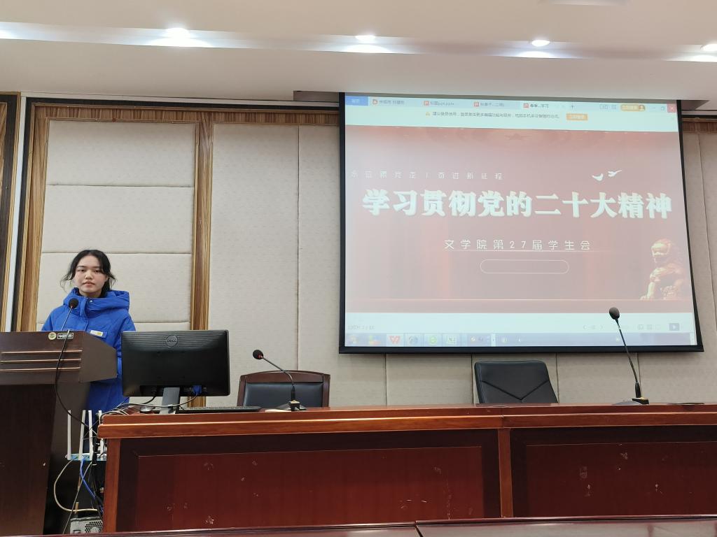 (通讯员 倪溪蔓 吴越若华 唐清华)3月29日中午,威廉希尔中文网站平台学生会于文渊楼216报告厅开展二十大精神主题学习活动。此次主题学习活动由办公室志愿者王玥醒主持,主席团成员尹婕主讲,全体学生会成员参与此次会议。