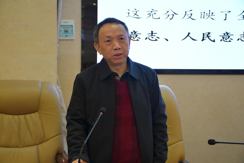 肖北庚对两会的基本背景、各项议程和主要精神为学院师生进行详细解读。他指出,今年的全国两会是在全面贯彻落实党的二十大精神开局之年召开的重要会议,总体上看此次会议可分为五个重要部分。一是大会选举和决定任命了新一届国家机构领导人员,顺利实现了党中央确定的人事安排大格局。二是习近平总书记在大会期间发表的一系列重要讲话。三是会议审议并批准了一系列工作报告,审查批准了国民经济和社会发展的计划、预算,为现代化国家建设开好局起好步提供了战略指引。四是大会批准了国务院机构改革方案,这将为党和国家事业取得历史性成就、发生历史性变革提供有力保障,也为继续深化党和国家机构改革积累宝贵经验。五是大会审议通过了立法法修正草案。最后,肖北庚对法学院参与立法建设的教师表示感谢,同时结合法学院的事业发展向全体教职工提出几点要求:一是要深入学习此次会议精神,全面贯彻落实二十大要求,牢牢把握高质量发展的首要任务,坚持把习近平新时代中国特色社会主义思想和党的二十大精神作为根本遵循;二是加强对我国GDP和新出台法律法规的关注,深入思考目前存在的问题,通过对问题的解决推动社会经济发展。他表示,全国两会吹响了全面贯彻落实党的二十大精神的集结号,开启了全面建设社会主义现代化国家的新篇章,法学院师生应聚焦时代使命,推动学科建设,深入学习领会党的二十大精神,立足法治实践,将学科发展与国家需求相结合,抓住发展机遇,为国家建设和学院发展做出更大贡献。